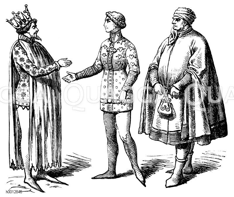 Franzosen (1300-1400), links: Fürst, mitte: Vornehmer Mann, rechts: Bürger: Zeichnung/Illustration/Holzstich – – French (1300-1400), left: Prince, middle: noble man, right: citizen – Français (1300-1400), gauche: prince, milieu: homme noble, droit: citoyen
