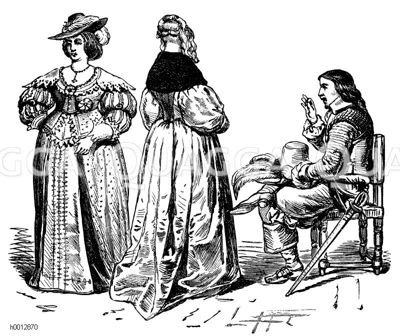 Zeitalter des 30jöhrigen Krieges (1600-1650), links: Dame (1630-1640), mitte und rechts: Dame und Offizier (1640-1650): Zeichnung/Illustration/Holzstich – – Age of the 30-year war (1600-1650), left: Lady (1630-1640), middle and right: Lady and officer (1640-1650) – Age of 30jöhrigen guerre (1600-1650), à gauche: Dame (1630-1640), centre et droite: Lady et officier (1640-1650)