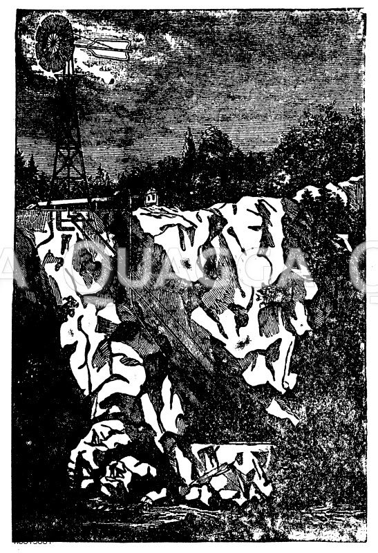 Entwässerung eines Steinbruchs durch einen Reinschschen Windmotor: Zeichnung/Illustration/Holzstich – – Drainage of a quarry by Rein’s wind engine – Drainage d’une carrière par une éolienne