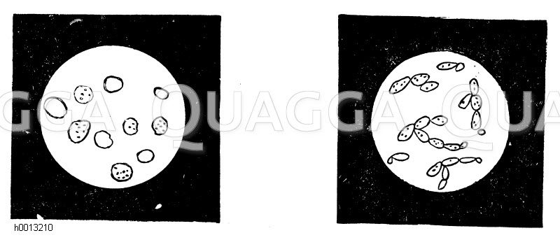 Oberhefe (links), Unterhefe (rechts): Zeichnung/Illustration/Holzstich – – Upper yeast (left), lower yeast (right) – Levure supérieure (à gauche), levure inférieure (à droite)