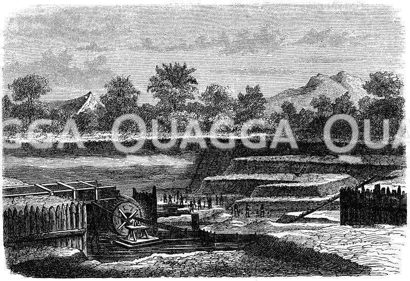 Zinnmine auf Banka: Zeichnung/Illustration/Holzstich – – Tin mine on Banka – Mine d’étain sur Banka