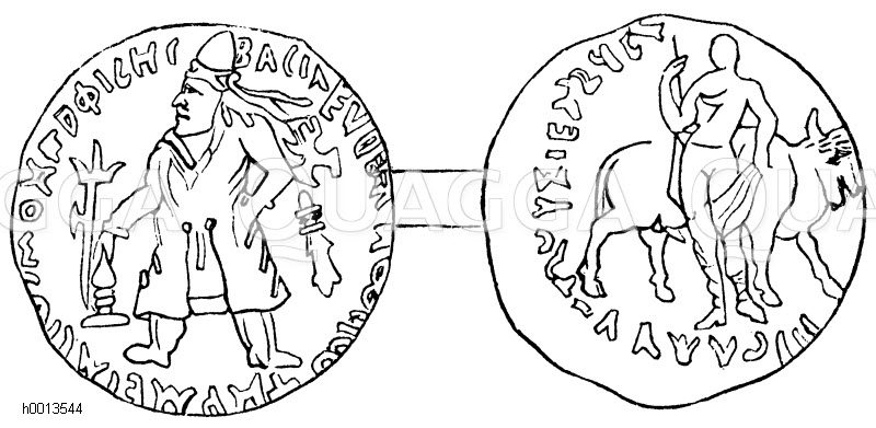 Baktrische Münzen: Zeichnung/Illustration/Holzstich – – –