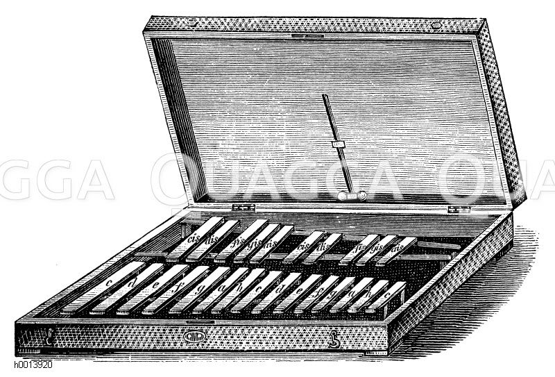 Glockenspiel oder Stahlharmonika: Zeichnung/Illustration/Holzstich – – Carillon or steel harmonica – Carillon ou harmonica en acier