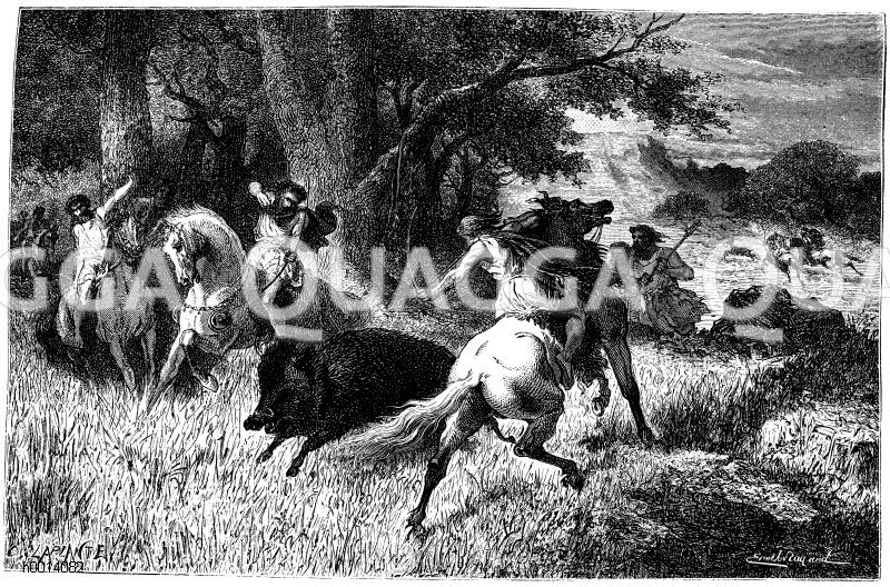 Eberjagd zur Steinzeit: Zeichnung/Illustration/Holzstich – – Boar hunt to the Stone Age –