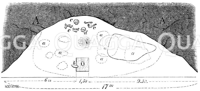 Horizontaler Aufriss der Cro-Magnon-Höhle. A) Kalkfelsen. Decke und Wände der Höhle bildend. N) mittlerer und höchster Teil der obersten Kulturschicht mit Herdfeuerrückständen. O) Basis eines modernen Pfeilers zur Unterstützung der Höhlendecke. a) Steinbruchstücke, die zur verschiedenen Zeiten von der Höhlendecke herabfielen, b) Elefantenzahn. C) Schädel eines alten Mannes, d) Schädel einer Frau, e) Menschliche Gebeine. Die Ziffern bedeuten metrisches Maß: Zeichnung/Illustration/Holzstich – – –