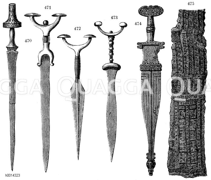 Gräberfunde von Hallstatt: Zeichnung/Illustration/Holzstich – – Grave finds from Hallstatt. 470-474) Swords and daggers. 475) Belt of bronze plate – Des tombes trouvées à Hallstatt. 470-474) Épées et poignards. 475) Courroie de plaque de bronze