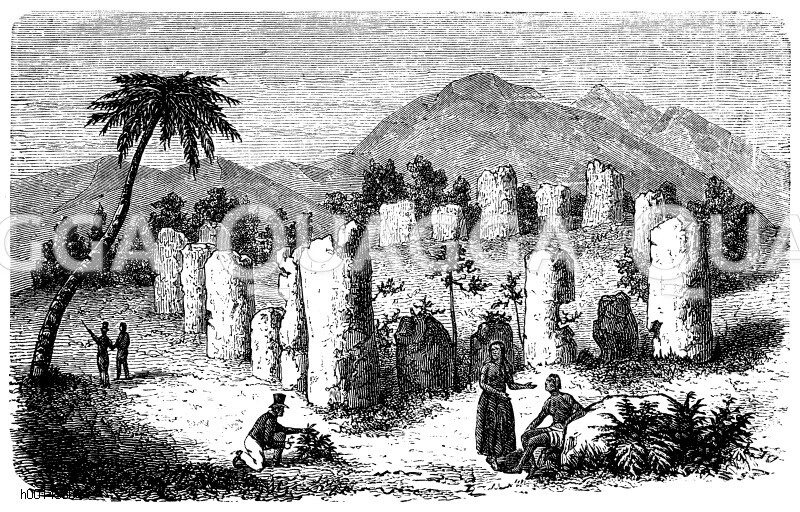 Steindenkmäler auf Tinian (Gruppe der Ladronen): Zeichnung/Illustration/Holzstich – – Stone monuments on Tinian (group of the Ladrons) – Monuments en pierre sur Tinian (groupe des Ladrons)