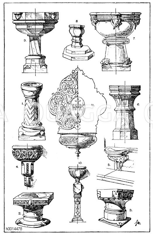 Weihwasserbecken: 1. Romanisches Weihwasserbecken aus dem Münster in Weißenburg (Raguenet). 2. Romanische Weihwasserbecken aus der Kruzifixkirche zu Compiegne. (Raguenet). 3. Romanisches Taufbecken aus einer Kirche in der Picardie. (Raguenet). 4. Romanisches Weihwasserbecken aus der Kirche zu Charleville. 5. Weihwasserbecken aus dem 12. Jahrhundert. (Viollet-Ie-Duc). 6. Weihwasserbecken aus dem 16. Jahrhundert. Kirche zu Masd’Azil. Ariége. (Raguenet). 7. Taufbecken aus dem 17. Jahrhundert. Kirche zu Cormontreuil. (Raguenet). 8. Taufbecken aus einer Kirche der Picardie. (Raguenet). 9. Romanisches Taufbecken aus der Kirche zu Couthuin in Belgien Architekt Halkin. (Raguenet). 19. Jahrhundert. 10. Weihwasserbecken aus dem 16. Jahrhundert. Schlosskapelle zu Mello in Frankreich. (Raguenet). 11. Weihwasserbecken, in Silber getrieben. K. Museum in Stuttgart. 17. Jahrhundert. (Kunsthandwerk): Zeichnung/Illustration/Holzstich – – –