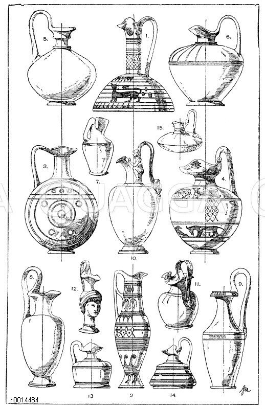 ![1. Griechischer Prochus von archaischer Form und Verzierungsweise bemalter Ton. 2. Griechischer Prochus, dem geometrischen Stil angehörend, schwarz bemalter, roter Ton. 3. Griechisches (zyprisches) Gußgefäß geometrischen Stils, gelber Ton, braun bemalt. Vasensammlung in München. (Lau). 4. Griechische Önochoe, asiatisierend, gelber bemalter Ton. (Semper). 5. Kleines antikes Gußgefäß, gelber Ton, schwarz bemalt. Vereinigte Sammlungen in Karlsruhe. 6. Kleines antikes Gußgefäß, schwarz bemalter Ton. Ornamente eingegraben. Vereinigte Sammlungen in Karlsruhe. 7.-9. Griechische Gußgefäße aus bemaltem Ton. 10. Griechisches Gußgefäß aus Bronze, von hervorragender Bedeutung. Im Besitze des Herrn von Pulszky in Pest. 11. Gräko-italisches Gußgefäß aus Bronze. 12. Prochus in Form eines weiblichen Kopfes. Römisches Museum. 13.-14. Antike Olpen aus bemaltem Ton. 15. Antike Olpe aus Bronze. Römisches Museum. [Digital]](https://www.quagga-illustrations.de/wp-content/uploads/2014/03/h0014484.jpg)
