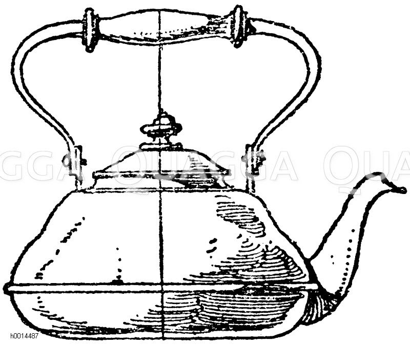Teekessel aus Metall, Bügelhenkel mit Holzgriff.: Zeichnung/Illustration/Holzstich – – –