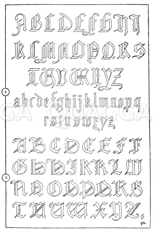 1. Gotisches Alphabet in Frakturschrift aus dem Jahre 1467. (Hrachowina). 2. Gotisches Alphabet in Frakturschrift. (Das Alphabet ist nicht einheitlich, sondern aus verschiedenen Schriften zusammengestellt): Zeichnung/Illustration/Holzstich – – –