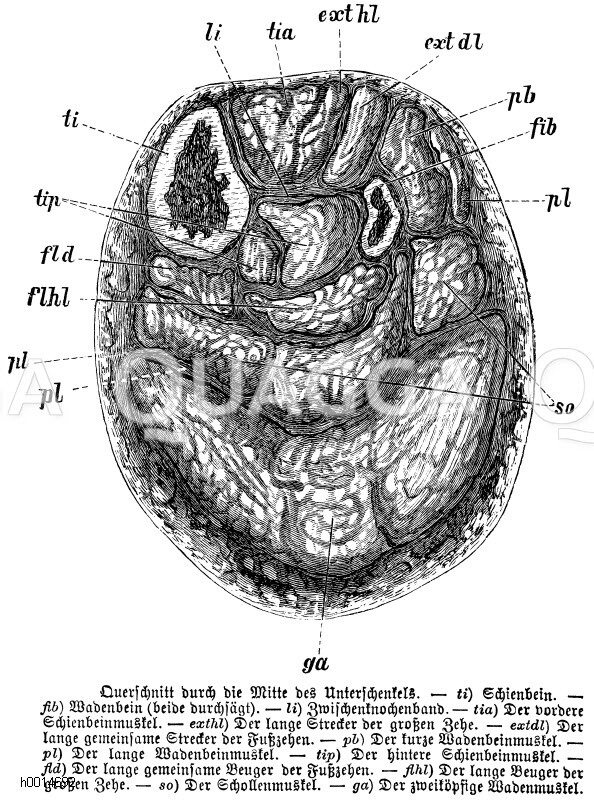 Unterschenkel: Querschnitt durch die Mitte: Zeichnung/Illustration/Holzstich – – Lower leg: cross section through the middle – Jambe inférieure: coupe transversale au milieu