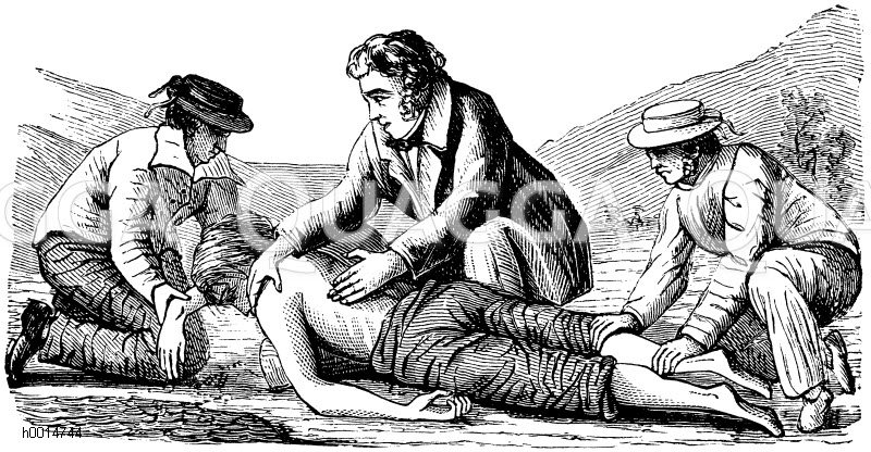 Künstliche Atmung (Wiederbelebung). Marshall-Hall. 1. Position: Zeichnung/Illustration/Holzstich – – Artificial respiration (revival). Marshall Hall. 1st position – Respiration artificielle (réveil). Marshall Hall. 1ère position