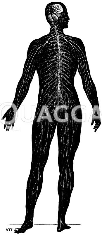 Gehirn, Rückenmark und Nerven: Zeichnung/Illustration/Holzstich – – Human: Brain, spinal cord and nerves – Cerveau, moelle épinière et nerfs