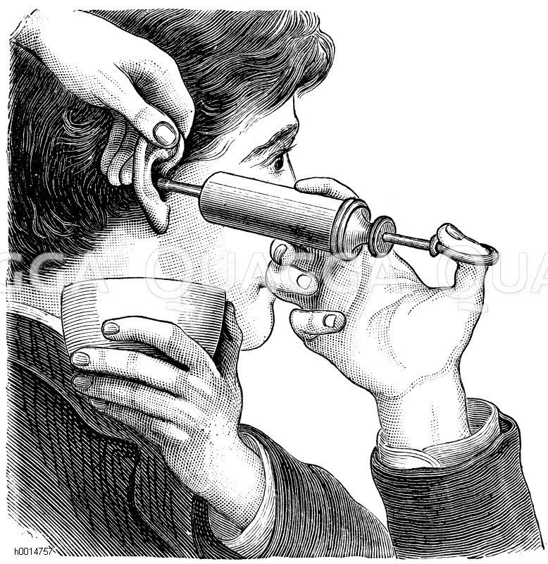 Anwendung der Ohrspritze: Zeichnung/Illustration/Holzstich – – Application of the ear syringe – Application de la seringue auriculaire