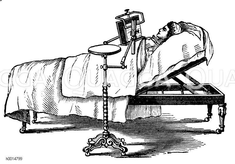 Englisches Krankenbett mit Lesepult: Zeichnung/Illustration/Holzstich – – English hospital bed with lectern – Lit d’hôpital anglais avec lutrin