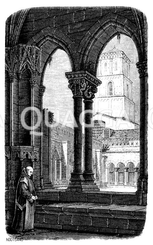 Kreuzgang der Kathedrale zu Arles mit Mönch: Zeichnung/Illustration/Holzstich – – Cloister of the cathedral at Arles with monk –