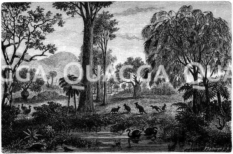 Schema: Australische Landschaft: Zeichnung/Illustration/Holzstich – – Scheme: Australian landscape with emus, kangaroos, black swans, lyre bird, bottle tree, Xanthorrhoea, tree fern, rubber plant, Australian baobab tree and casuarina tree –