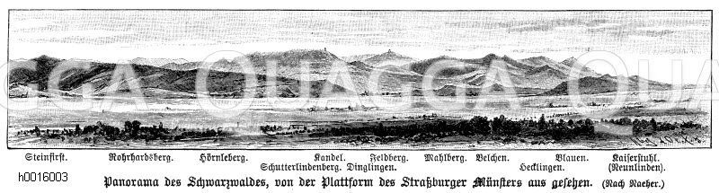 Panorama des Schwarzwaldes, von der Plattform des Straßburger Münsters aus gesehen (nach Naeher) Steinfirst, Rohrhardsberg, Hörnleberg, Kandel, Schutterlindenberg, Dinglingen, Feldberg, Mahlberg, Belchen, Hecklingen, Baluen, Kaiserstuhl (Neunlinden): Zeichnung/Illustration/Holzstich – – Panorama of the Black Forest, seen from the platform of the Strasbourg Cathedral (near Naeher) Steinfirst, Rohrhardsberg, Hörnleberg, Kandel, Schutterlindenberg, Dinglingen, Feldberg, Mahlberg, Belchen, Hecklingen, Baluen, Kaiserstuhl (Neunlinden) – Panorama de la Forêt Noire, vu de la plate-forme de la cathédrale de Strasbourg (après en détail) Steinfirst, Rohrhardsberg, Hörnleberg, Kandel, Schutterlindenberg Berg, Dinglingen, terrain Berg, Mahlberg, Ballon arrière Lingen, Baluen, président Kaiser (neuf Linden)