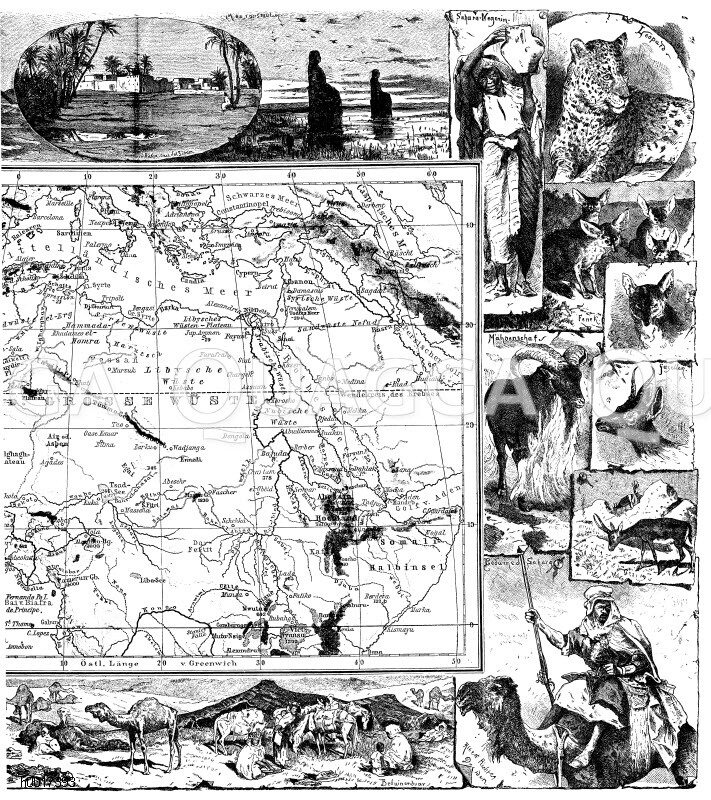 Collage und Karte: Nördliches Afrika, rechte Hälfte: Zeichnung/Illustration/Holzstich – – Collage and map: Northern Africa, right half –