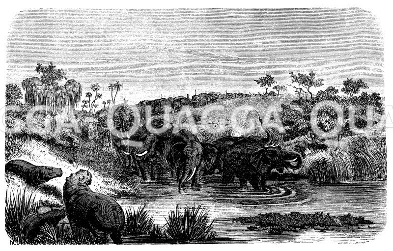 Tierleben am Tschadsee: Elefanten, Flusspferde: Zeichnung/Illustration/Holzstich – – Animal life on Lake Chad : elephants, hippopotamuses – Vie animale sur le lac Tchad: éléphants, hippopotames