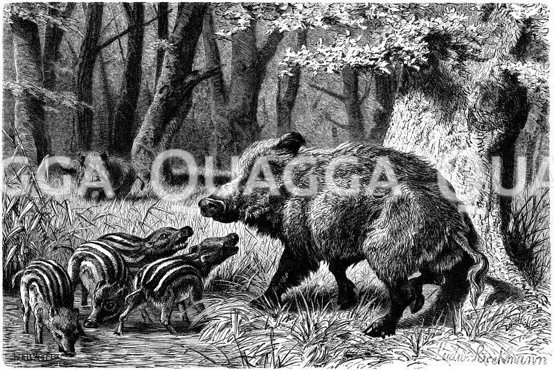 Wildschwein: Zeichnung/Illustration/Holzstich – Sus scrofa – Boar –