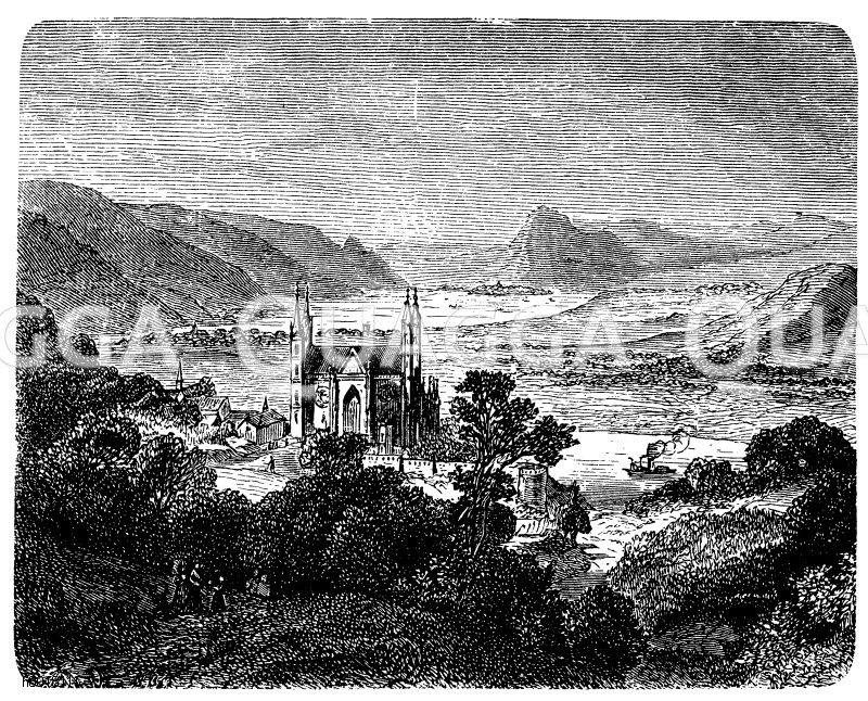 Apollinarisberg und die neue Kirche bei Remagen am Rhein: Zeichnung/Illustration/Holzstich – – Apollinarisberg and the new church near Remagen am Rhein – Apollinarisberg et la nouvelle église près de Remagen am Rhein