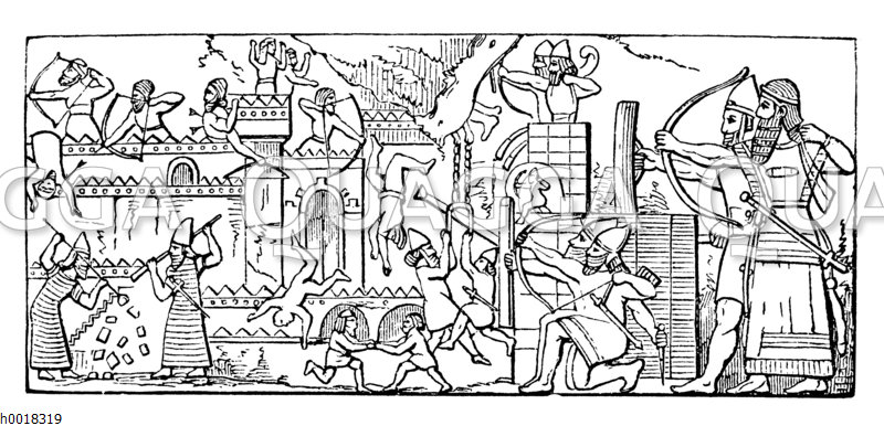 Assyrische Belagerungsszene: Zeichnung/Illustration/Holzstich – – Assyrian siege scene – Scène du siège assyrien