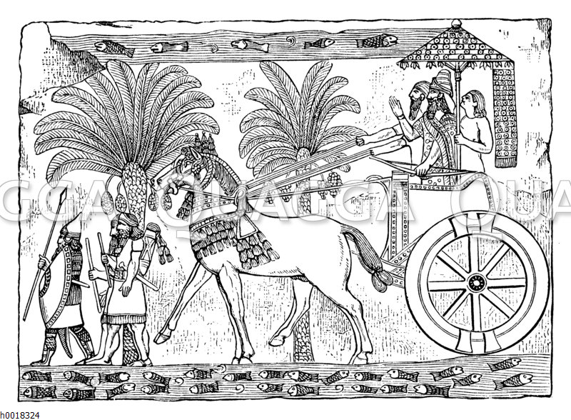 Siegreich heimkehrender assyrischer König: Zeichnung/Illustration/Holzstich – – Victorious returning Assyrian king – Roi assyrien victorieux de retour au pays