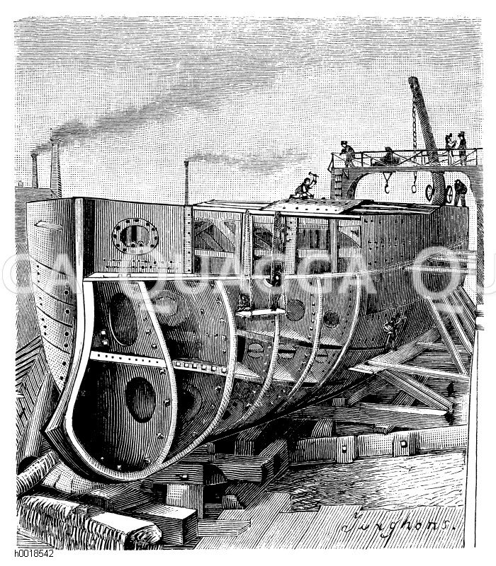 Schiff im Bau: Zeichnung/Illustration/Holzstich – – Ship under construction – Navire en construction