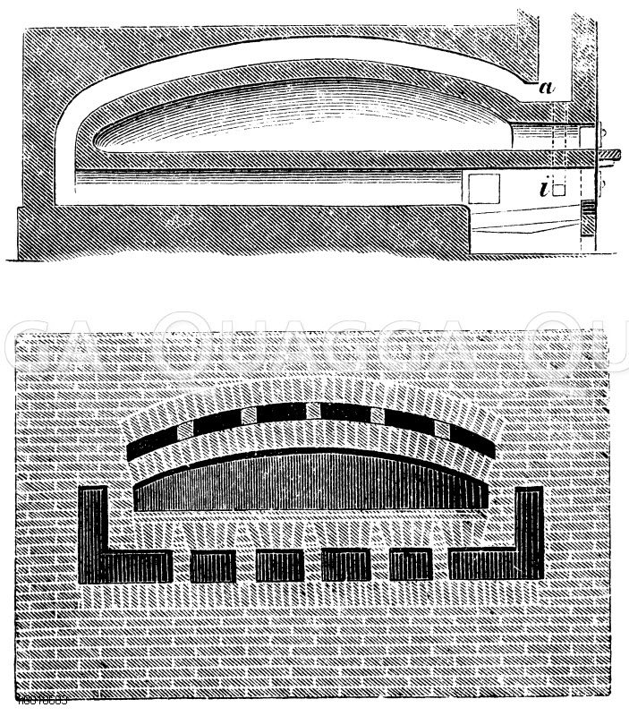 Oben: Längsschnitt eines von außen zu heizenden Backofens, unten: Feuerungsdurchzüge eines von außen zu heizenden Backofens: Zeichnung/Illustration/Holzstich – – Above: Longitudinal section of a baking oven to be heated from the outside, below: Firing passages of a baking oven to be heated from the outside –