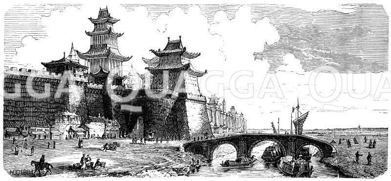 Brücke und Stadtmauer in Peking: Zeichnung/Illustration/Holzstich – – Bridge and city wall in Beijing – Pont et muraille à Pékin