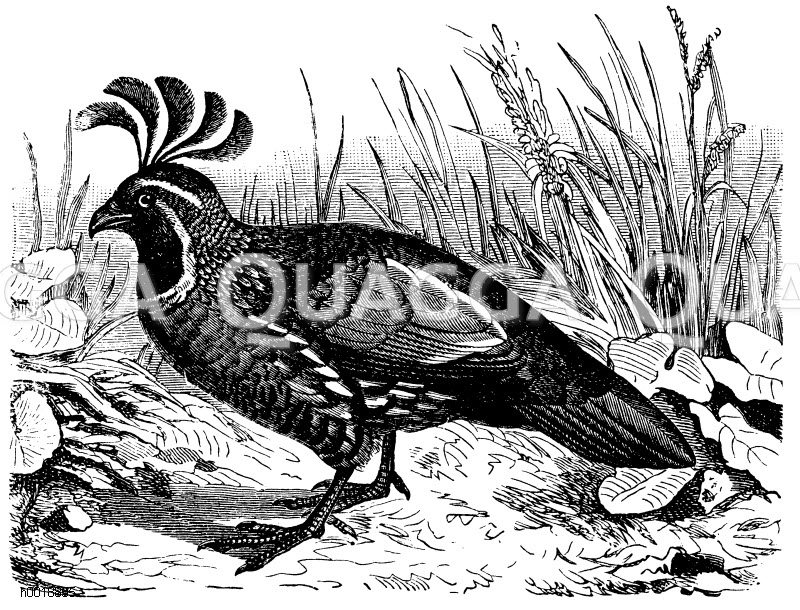 Kalifornische Schopfwachtel: Zeichnung/Illustration/Holzstich – Lophortyx californianus – –