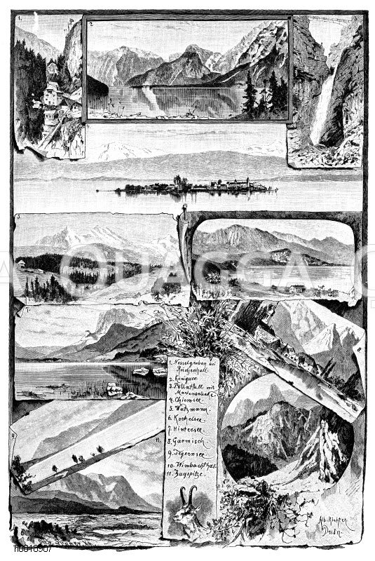 Bayern.1) Nesselgraben bei Reichenhall, 2) Königssee, 3) Pöllatal mit Marienbrücke, 4) Chiemsee, 5) Watzmann, 6)Hintersee, 8) Garmisch, 9) Tegernsee, 10) Wimbachthal, 11) Zugspitze. Zeichnung von Albert Richter: Zeichnung/Illustration/Holzstich – – Bavaria.1) Nesselgraben near Reichenhall, 2) Königssee, 3) Pöllatal with Marienbrücke, 4) Chiemsee, 5) Watzmann, 6) Hintersee, 8) Garmisch, 9) Tegernsee, 10) Wimbachthal, 11) Zugspitze. Drawing by Albert Richter – Bavaria.1) Nesselgraben près de Reichenhall, 2) Königssee, 3) Pöllatal avec Marienbrücke, 4) Chiemsee, 5) Watzmann, 6) Hintersee, 8) Garmisch, 9) Tegernsee, 10) Wimbachthal, 11) Zugspitze. Dessin d’Albert Richter