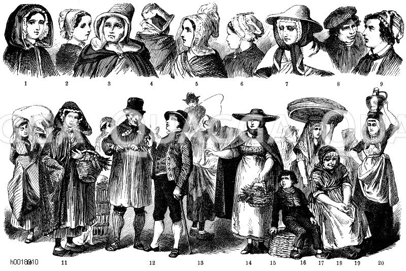 Belgische Volkstrachten. 1) Westflandern (Gent), 2-6, 8, 13) Nordbrabant (Antwerpen), 7, 11, 12) Südbrabant (Brüssel), 10) Hennegau, 9, 14-20) südliche Provinzen: Zeichnung/Illustration/Holzstich – – Belgian folk costumes. 1) West Flanders (Gent), 2-6, 8, 13) North Brabant (Antwerp), 7, 11, 12) South Brabant (Brussels), 10) Hainaut, 9, 14-20) southern provinces – Costumes folkloriques belges. 1) Flandre Occidentale (Gent), 2-6, 8, 13) Brabant septentrional (Anvers), 7, 11, 12) Südbrabant (Bruxelles), 10) Hainaut, du sud 9, 14-20) provinces
