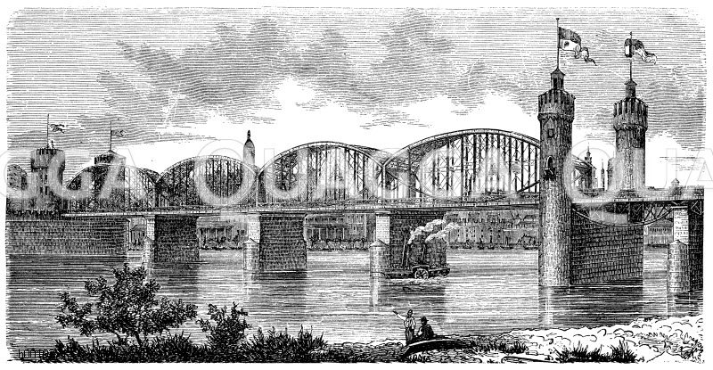 Eisenbahnbrücke über den Rhein bei Mainz: Zeichnung/Illustration/Holzstich – – Railway bridge over the Rhine at Mainz – Pont ferroviaire sur le Rhin à Mayence