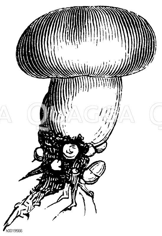 Champignon: Jüngeres Exemplar: Zeichnung/Illustration/Holzstich – Agaricus campestris – –