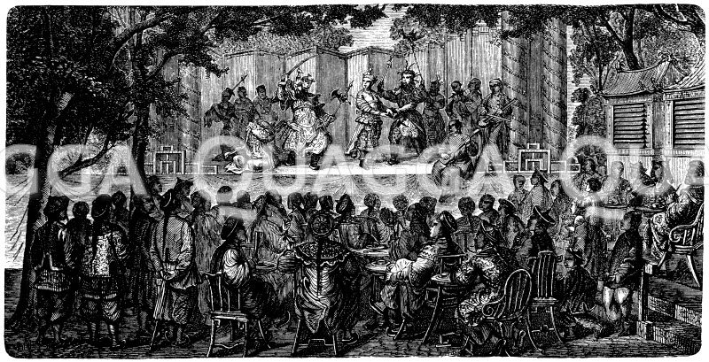 Theatervorstellung in China: Zeichnung/Illustration/Holzstich – – Theater performance in China_Theatre performance in China – Représentation théâtrale en Chine_Représentation théâtrale en Chine