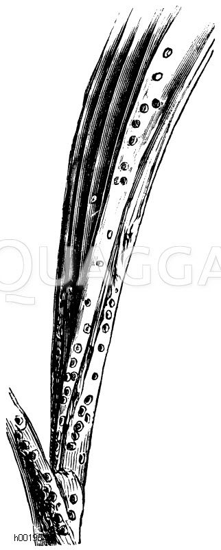 Stark von Schildläusen befallenes, in der Entwicklung begriffenes Blatt einer Arecapalme: Zeichnung/Illustration/Holzstich – – –
