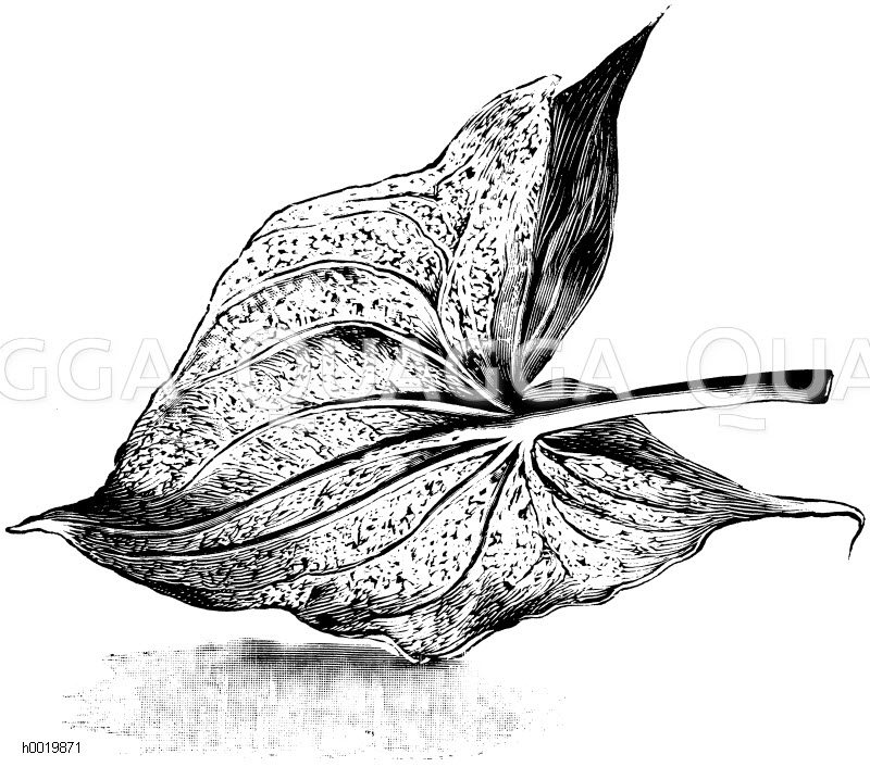 Rückseite eines von Spinnmilben befallenen Blattes des Pfeilkrautes von Montevideo: Zeichnung/Illustration/Holzstich – Sagittaria sagittifolia – arrowhead – Sagittaire à feuilles en flèche