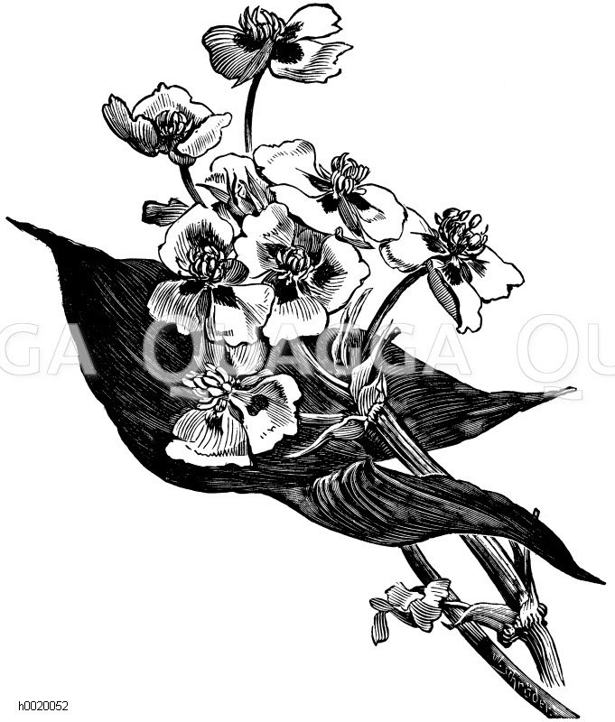 Blatt und Blüten des Pfeilkrautes von Montevideo: Zeichnung/Illustration/Holzstich – Sagittaria sagittifolia – arrowhead – Sagittaire à feuilles en flèche