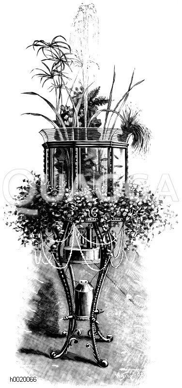 Aquarium mit Springbrunnen und Pflanzenkultur: Zeichnung/Illustration/Holzstich – – –