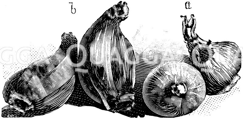 Jonquillenzwiebeln. a) kleine einfache wohlriechende, b) große einfache Jonquille: Zeichnung/Illustration/Holzstich – Narcissus Jonquilla – –