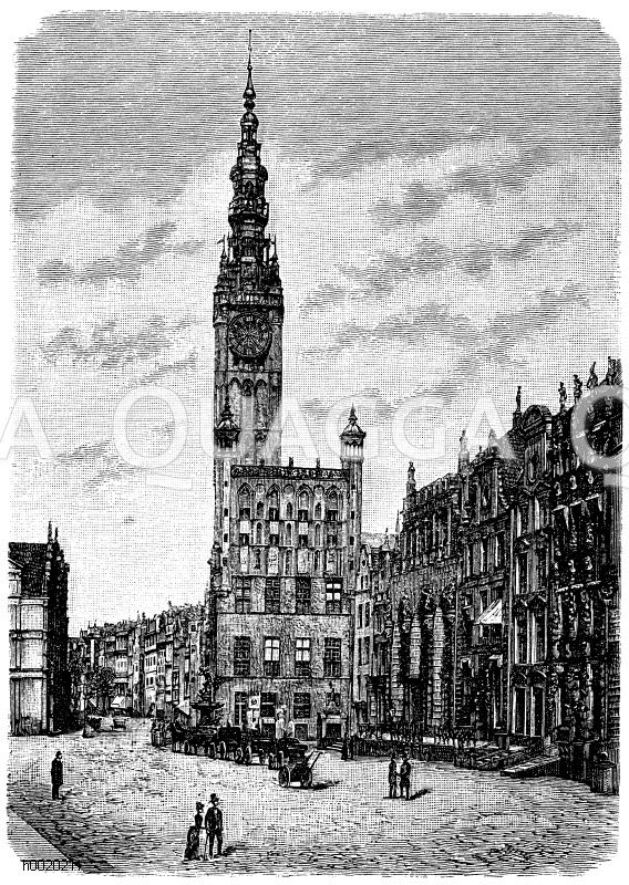 Rathaus mit dem Langenmarkt zu Danzig: Zeichnung/Illustration/Holzstich – – Town hall with the Langenmarkt in Gdansk – Hôtel de ville avec le Langenmarkt à Gdansk