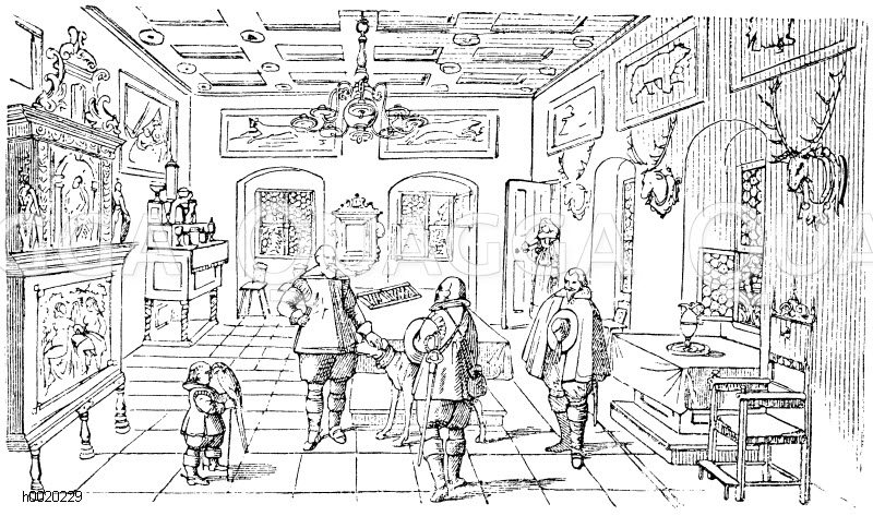 Wohnzimmer eines deutschen Fürsten: Zeichnung/Illustration/Holzstich – – Living room of a German prince. After Wolf Pirkner 1639. – Salon d’un prince allemand. D’après Wolf Pirkner 1639.