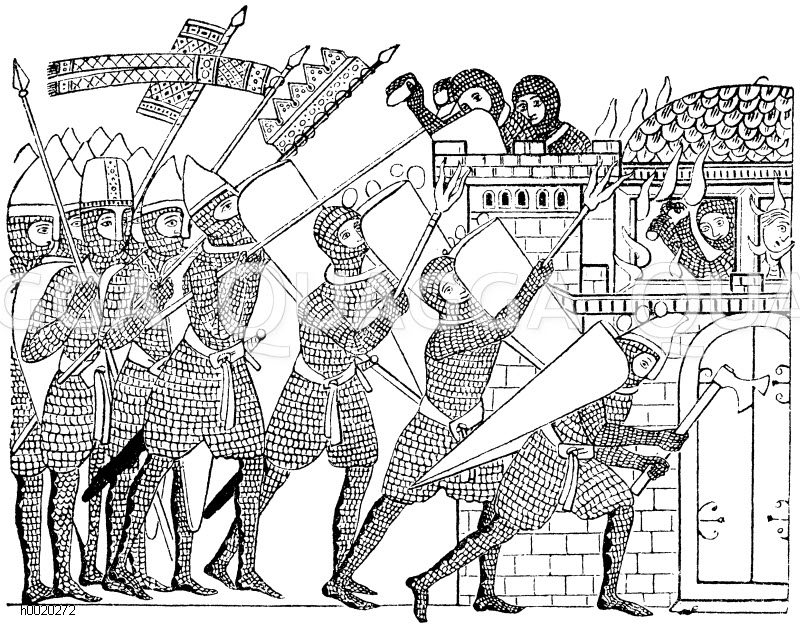 Belagerung einer Burg: Zeichnung/Illustration/Holzstich – – Siege of a castle. According to a picture in the manuscript of Hortus deliciarum the Herrad of Landsperg. 12th century – Siège d’un château. D’après une image du manuscrit d’Hortus deliciarum le Herrad de Landsperg. XIIe siècle