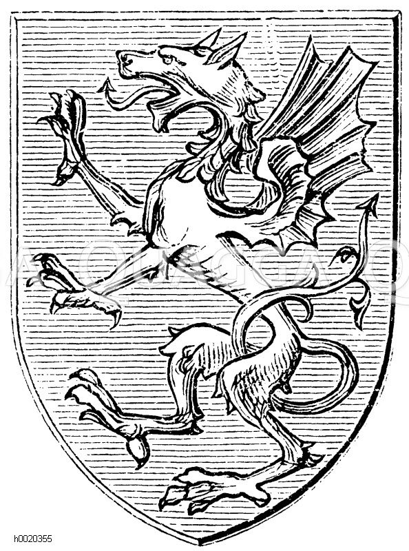 Heraldischer Drache aus dem späteren Mittelalter: Zeichnung/Illustration/Holzstich – – Heraldic Dragon from the later Middle Ages –