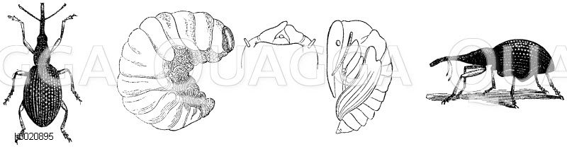 Sonnenliebendes Spitzmäuschen in der Rücken- und Seitenansicht, seine Larve, deren vorderer Kopfteil und seine Puppe: Zeichnung/Illustration/Holzstich – Apion apricans – –