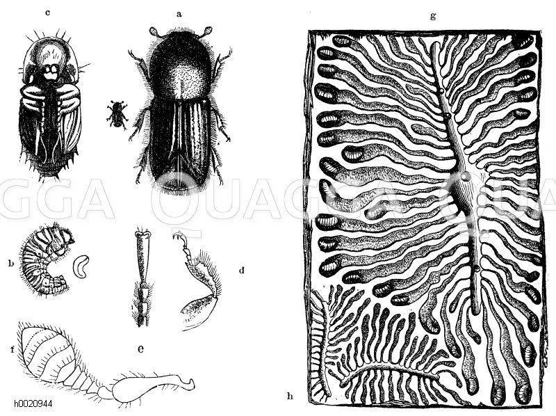 ![Achtzähniger Fichtenborkenkäfer. a) Käfer, b) Larve, c) Puppe, d) Bein, e) Fuß oder Tarse, f) Fühlhorn, g) Brutkolonie, h) ein Teil der Brutkolonie von Bostrichus chalcographus [Digital]](https://www.quagga-illustrations.de/wp-content/uploads/2014/04/h0020944.jpg)