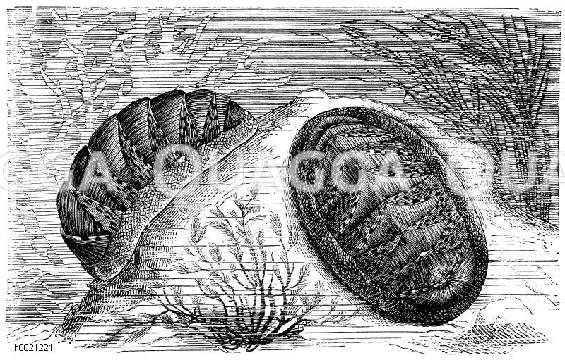 Elegante Käferschnecke: Zeichnung/Illustration/Holzstich – Chiton eleganus – –